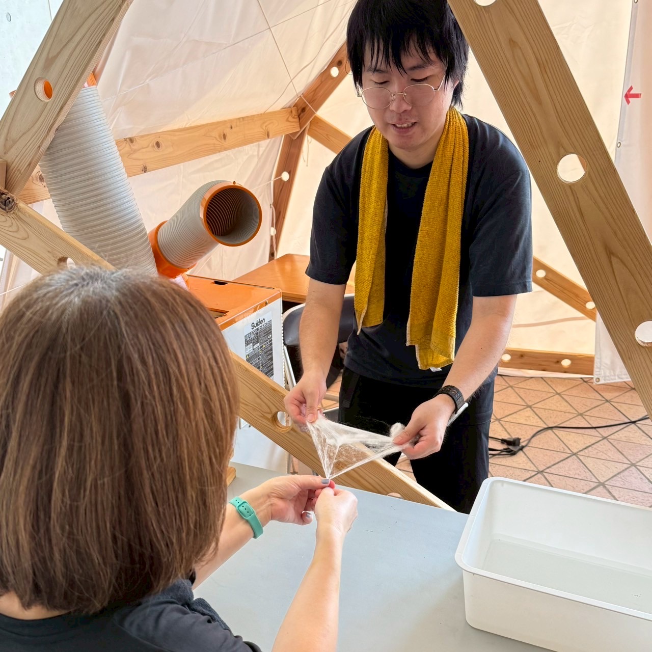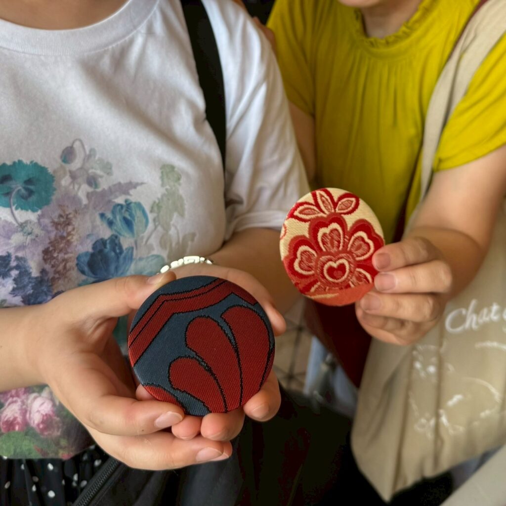 糸紡ぎ体験・糸繰り体験・着物を使った缶バッジ&缶ミラー作りの